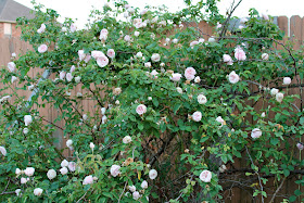 The white (with shades of pink) rose is New Dawn. This is the first year it has looked so beautiful. The antique climbing rose in the back is Cramsoi Superior